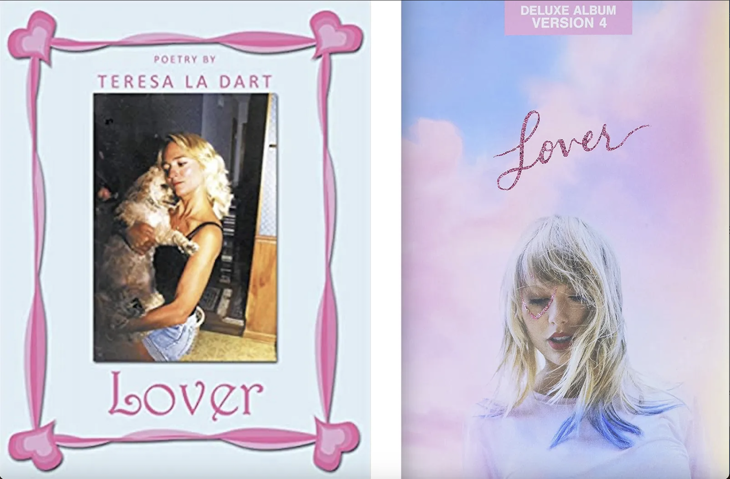 And here’s another one, also referenced in the Pitchfork article. Taylor Swift released a book with a deluxe version of her 2019 album, Lover. She’s being sued by a poet named Teresa La Dart, who released a poetry collection of the same name in 2010, and you can see why when you compare the covers of each book, in this image from a different Pitchfork article: